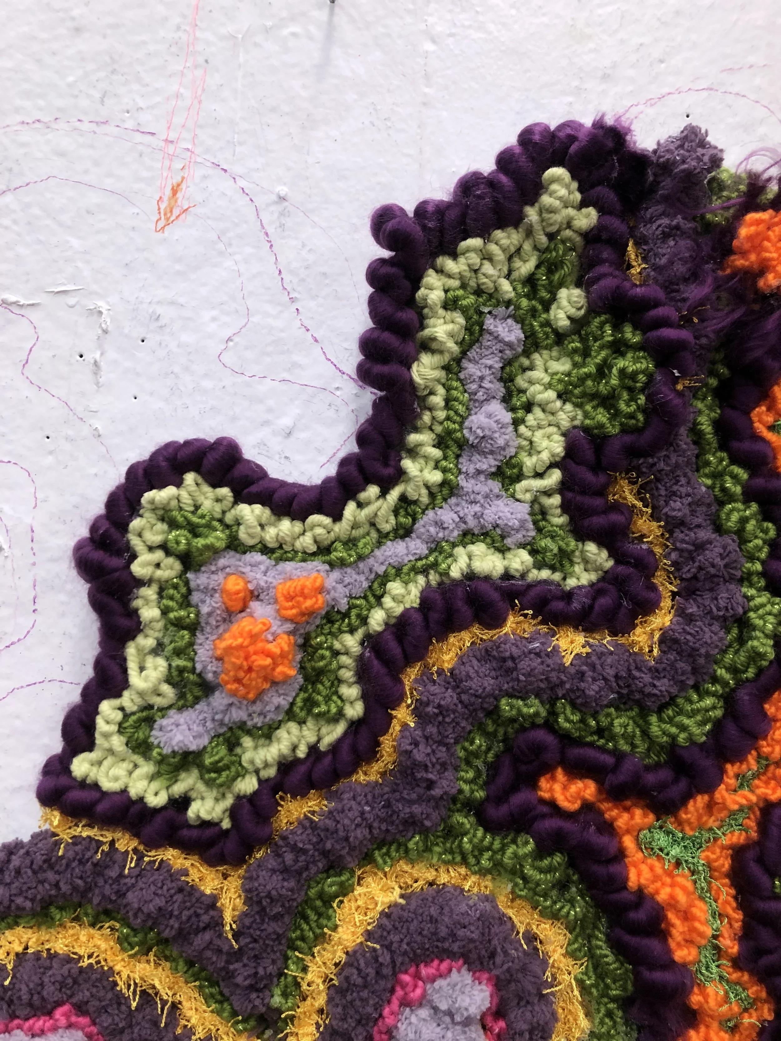 Process: the first step to my process is sketching out a loose shape on the wall. I then gather a large amount of aluminum foil and start hot gluing sheets of it together in layers of 3 to create a large aluminum foil sheet. The material gets put on the wall and shaped and carved out until it matches the intended shape. A visual representation of this can be seen in the 4th image I submitted. I then section off multiple long pieces of yarn and tape it to a surface. Once I have a table length full of sectioned off yarn, as seen in the last photo I submitted, I spin each section with a drill so that it bunches up after 1-3 minutes of spinning. The yarn bunch is then taped off and placed next to the current sculpture I am working on, as I move on the next section. Each bunched up yarn ball acts as a “swatch” of medium. Once I have multiple colors collected, I place the yarn wherever I feel naturally inclined to “make a mark” and proceed to glue it down. Section by section, the piece comes together while never stressing about the end result. Throughout this peaceful process, I hide little pieces of what makes my life blissful throughout the bunched up yarn. This is also intuitive and I never know where I will be placing my next object until I feel it out.